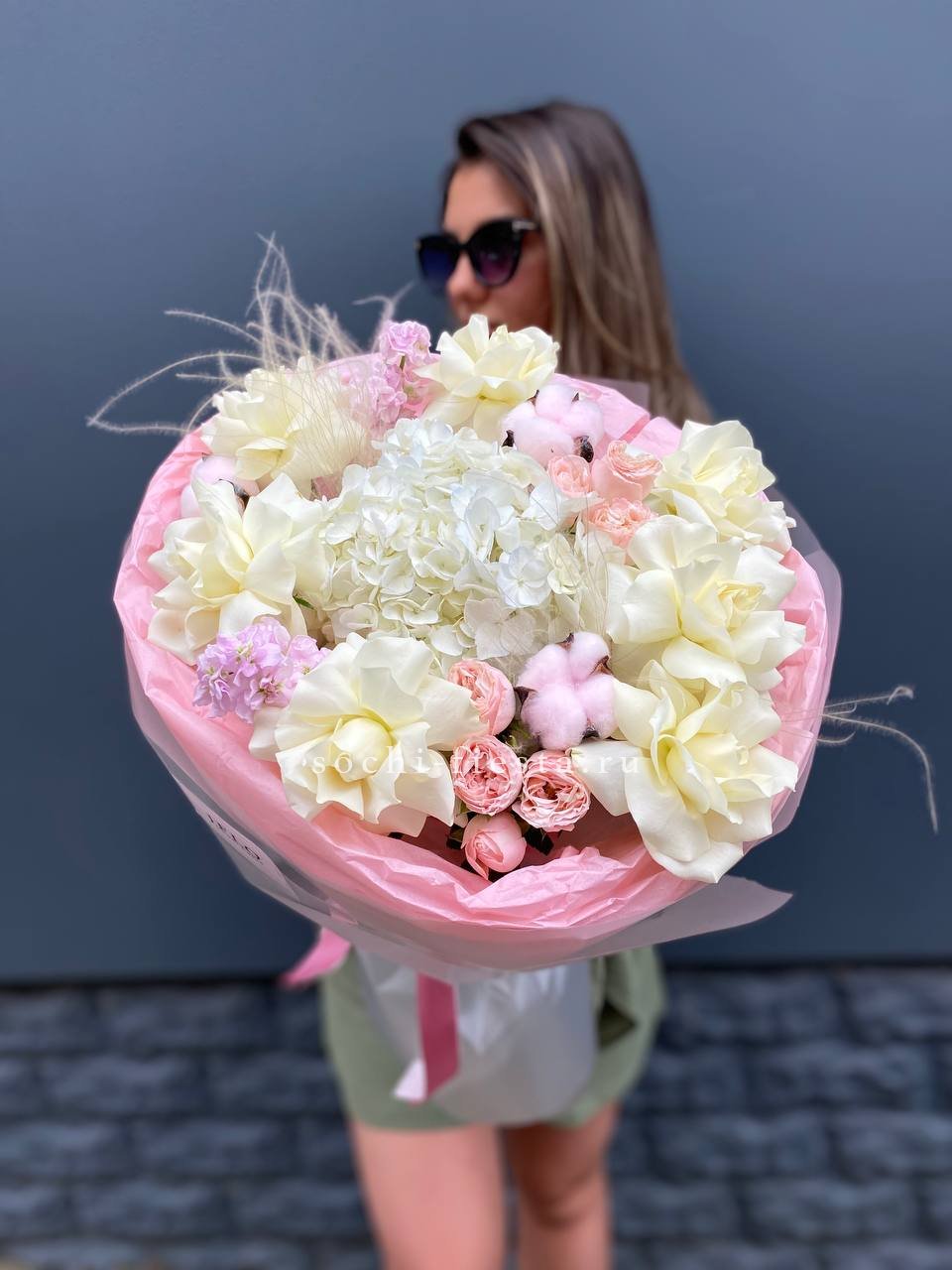 Яркие герберы и белоснежные лилии создают жизнерадостную композицию с чистым силуэтом. Озотамнус добавляет воздушности, а розы завершают образ свежестью и лёгкостью.