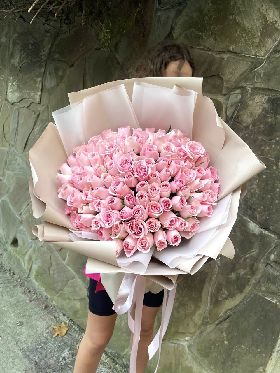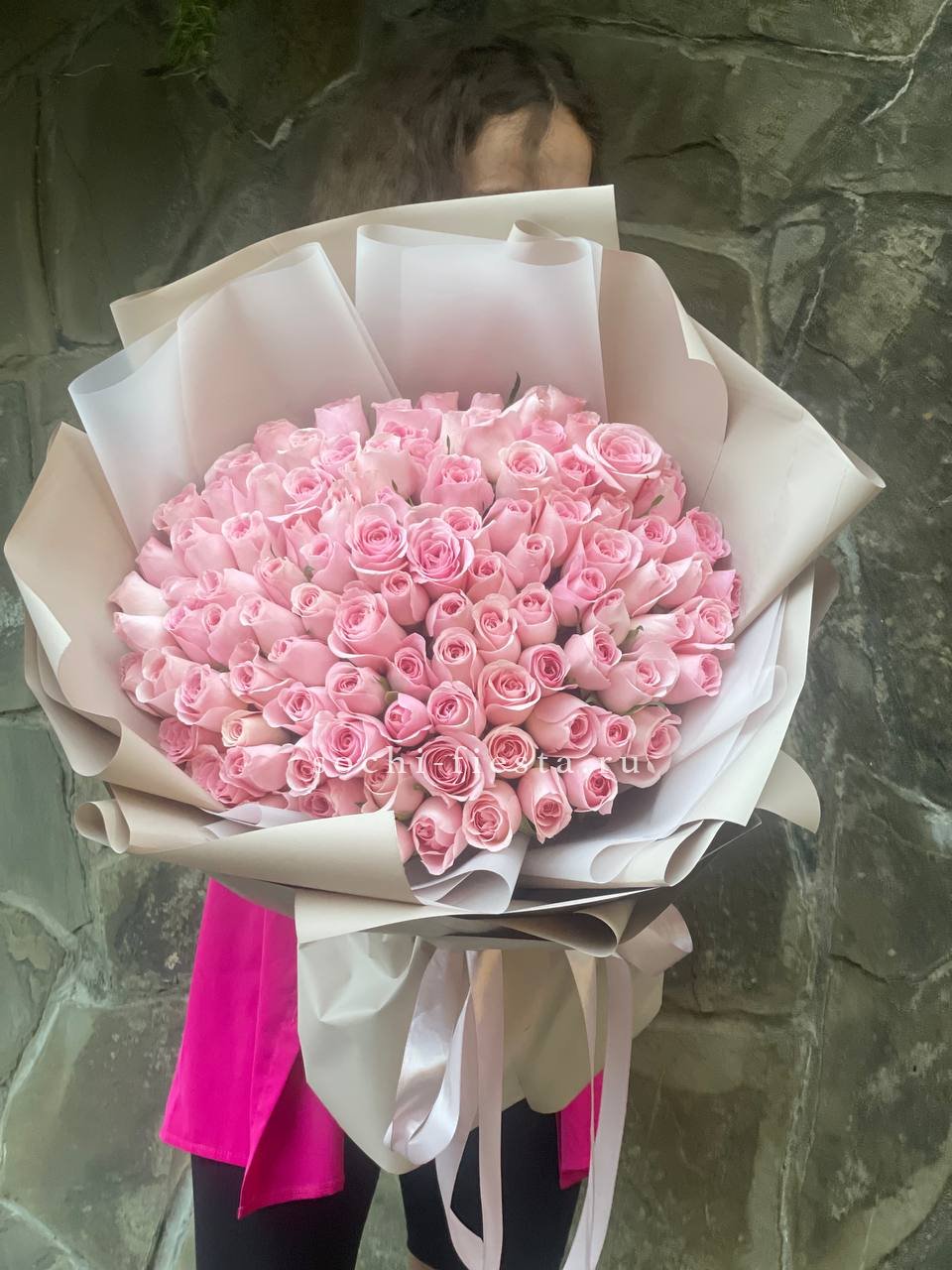 Сто одна роза белого цвета собрана в плетеную корзину и создает впечатление снежного сугроба. Такая композиция занимает пространство уверенно и притягивает взгляд своей безупречной чистотой.