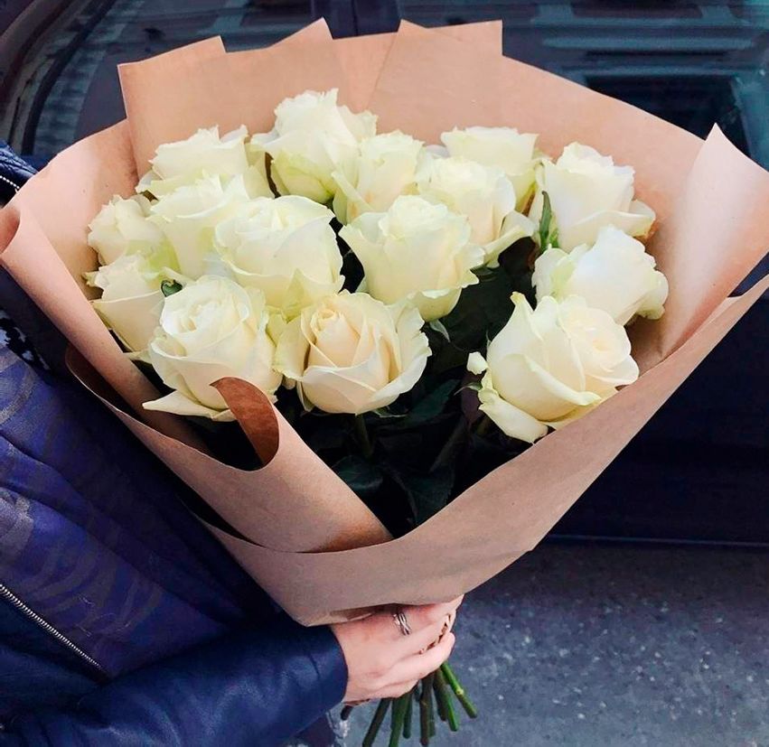 Пятнадцать белых роз в тонкой дизайнерской упаковке создают ощущение лёгкости и чистоты. Матовая текстура бумаги и мягкие складки подчёркивают форму каждого бутона. Композиция выглядит свежо и современно.