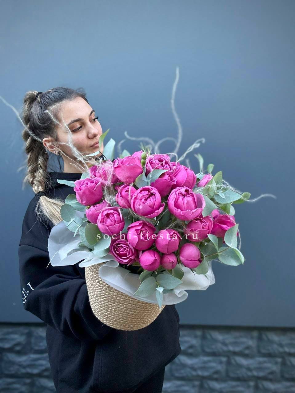 Пионовидные розы в джутовом кашпо